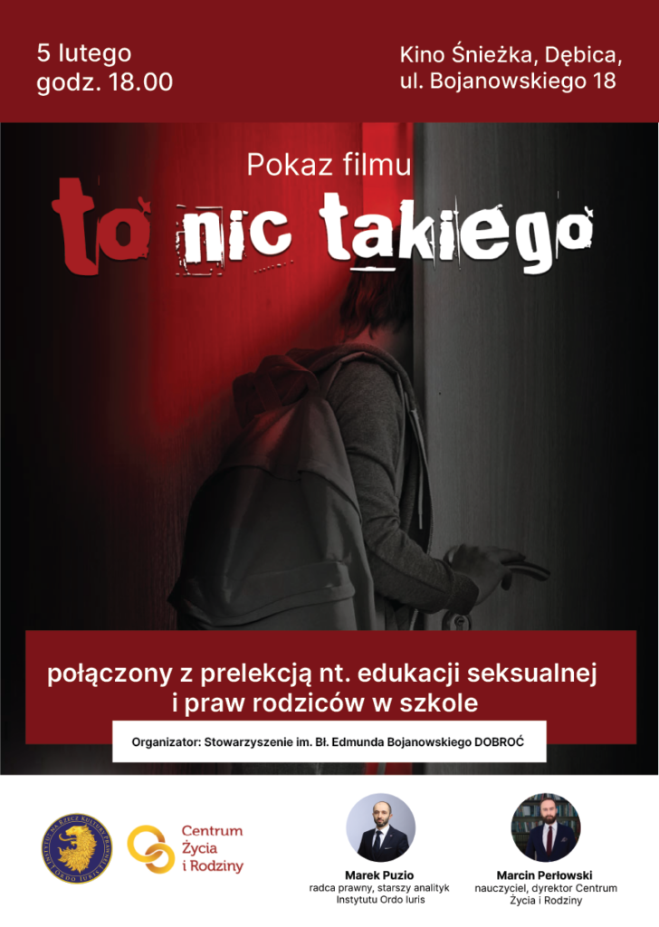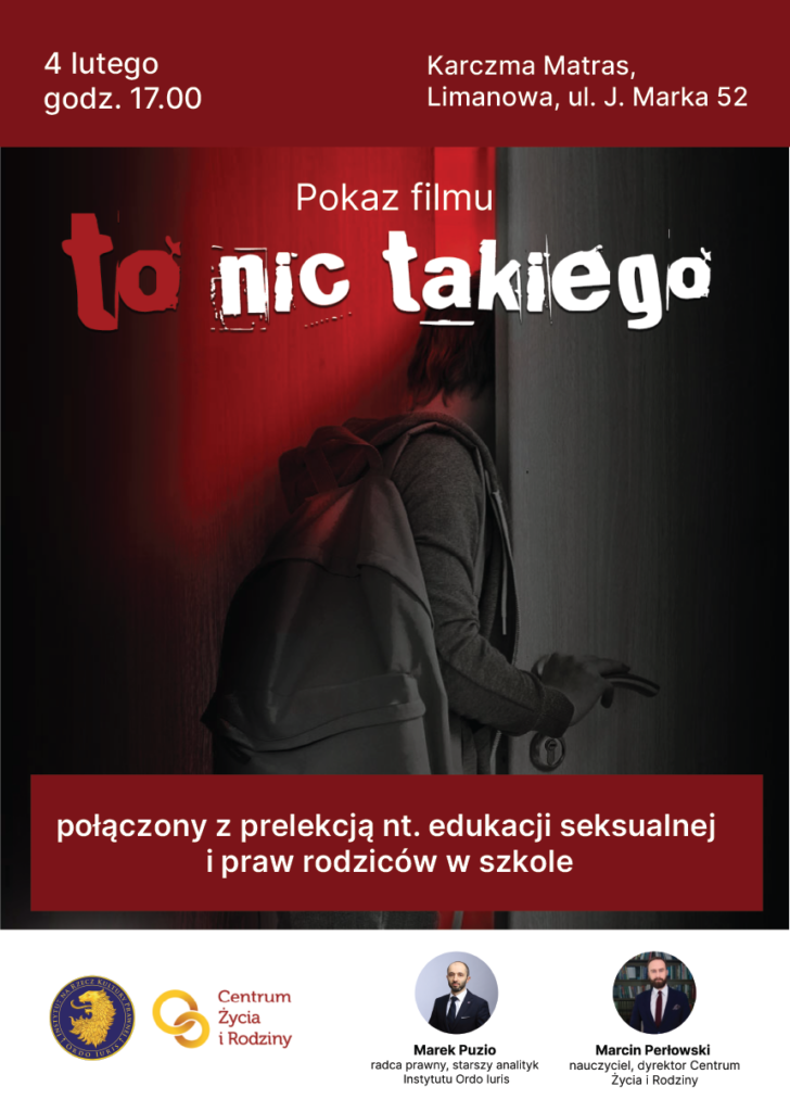Nie ustają próby przeforsowania ideologicznych programów w polskich szkołach. Jak się przed tym bronić? Temu zagadnieniu poświęcone będą spotkania dotyczące edukacji seksualnej i praw rodziców w szkole. Wydarzenia odbędą się w Limanowej i Dębicy. Gośćmi będą Marcin Perłowski – dyrektor Centrum Życia i Rodziny, oraz r.pr. Marek Puzio – starszy analityk Ordo Iuris. Spotkania będą połączone z projekcją filmu „To nic takiego” na temat edukacji seksualnej.